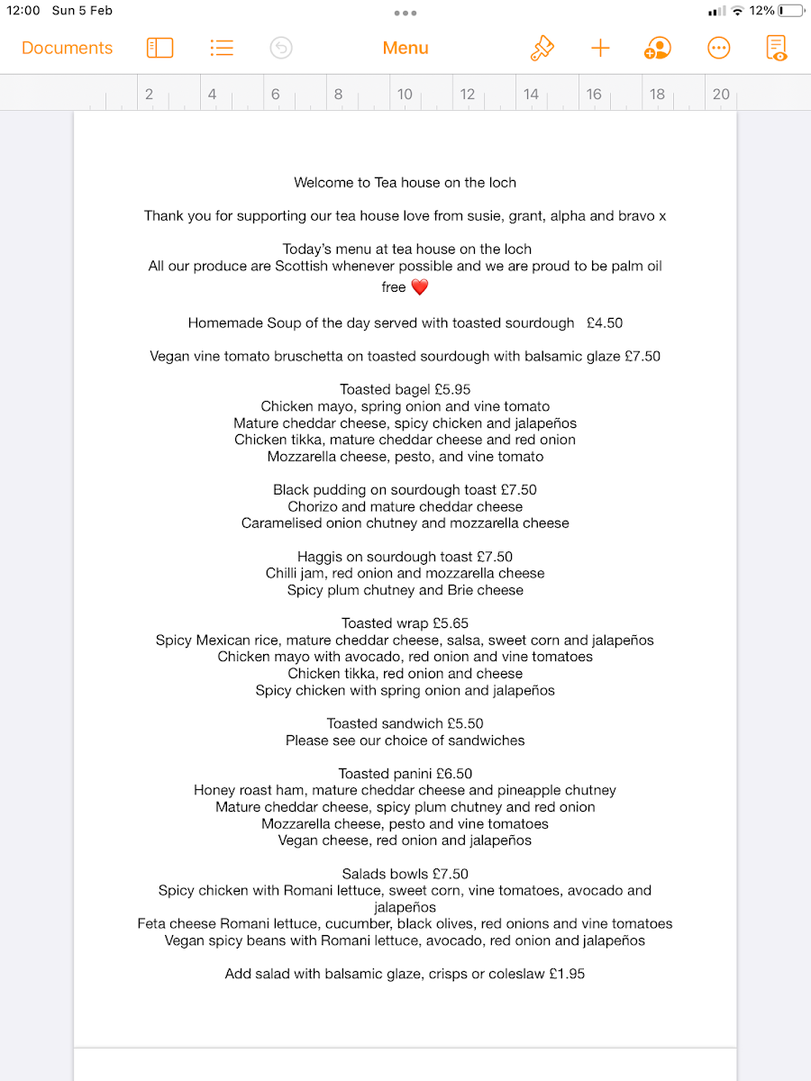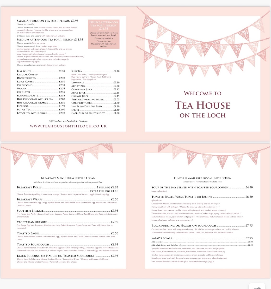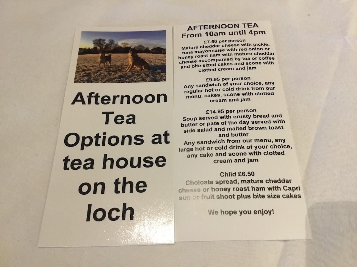 The menu at Tea House On The Loch offers a delightful range of lunch options, perfect for those looking for a satisfying meal in a cozy setting. Starting with the Soup of the Day, which is served with your choice of Toasted Sourdough, Toasted Bagel, Wrap, Toastie, or Panini. For those seeking something a bit heartier, the Black Pudding or Haggis on Sourdough is an enticing option. If you're in the mood for something lighter, the Feta Cheese Romani Salad Bowl provides a fresh and flavorful choice. The restaurant also offers a selection of breakfast wraps, including the classic Scottish Brekkie and the Vegetarian Brekkie, both of which promise a satisfying start to the day. Whether you're after a comforting soup, a light salad, or a hearty breakfast, Tea House On The Loch has something to cater to every taste.